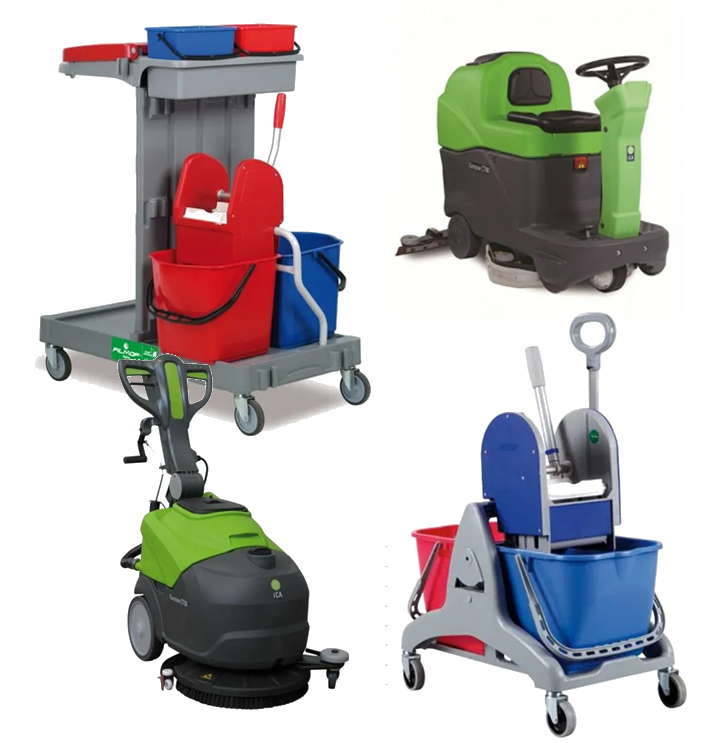 Aspirateurs et autolaveuses, balayeuses, machines de lavage, dépoussiérage et désinfection, nettoyeurs, essuyeurs, éponges, chariots de ménage, etc.